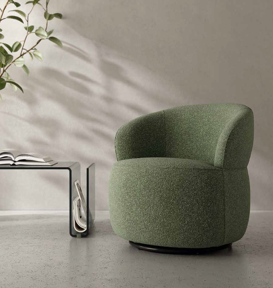 Butaca giratoria 360º tapizada. Estructura metálica negra. Combina una sentada cómoda con un diseño redondeado que suaviza el ambiente.