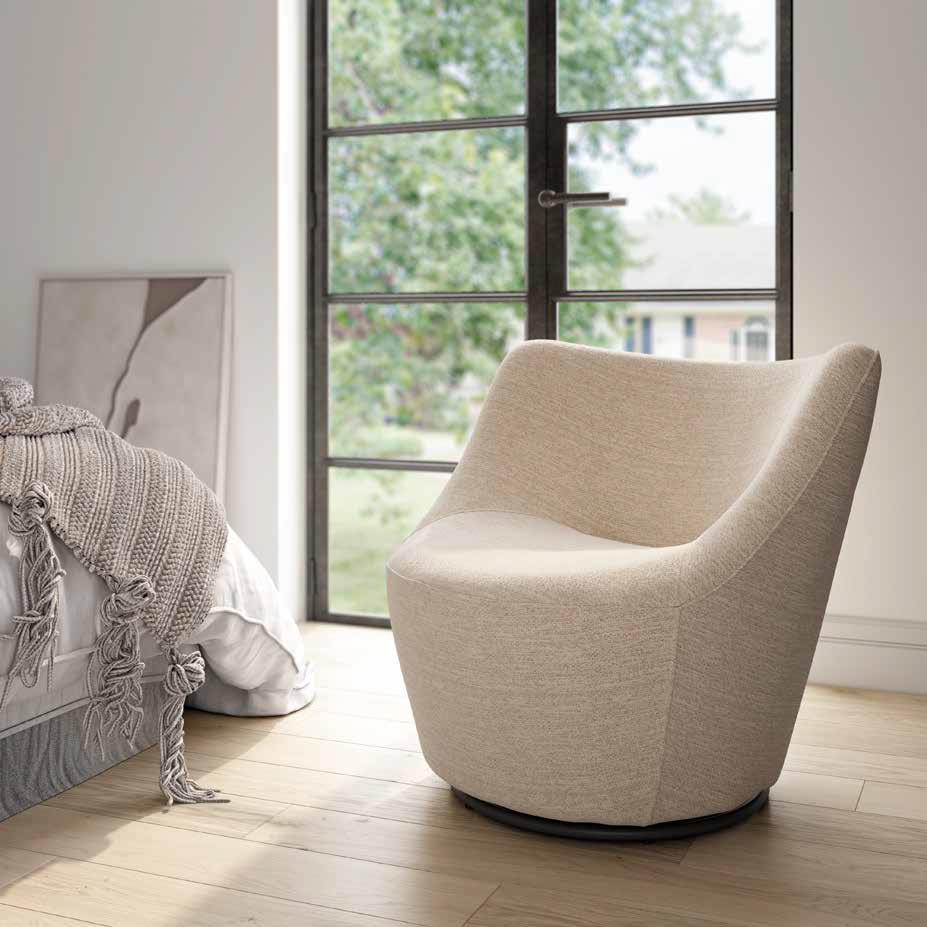 Butaca giratoria 360º tapizada. Estructura metálica negra. Su asiento generoso y su línea redondeada crean una pieza protagonista con gran confort visual.