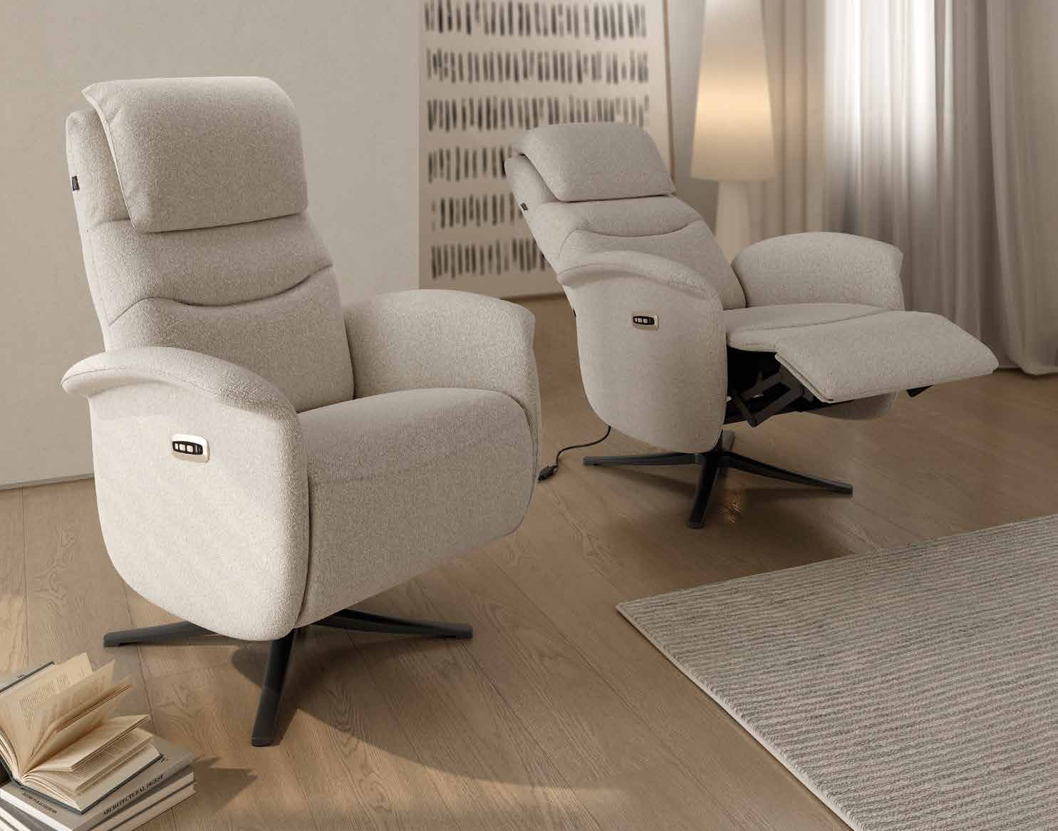 Butaca giratoria 360º tapizada. Relax eléctrica 2 motores. Cabezal ajustable en 3 posiciones. Pata metálica negra. Puerto de carga USB. Diseñada para un descanso cómodo y sofisticado, con un formato perfecto para uso diario.