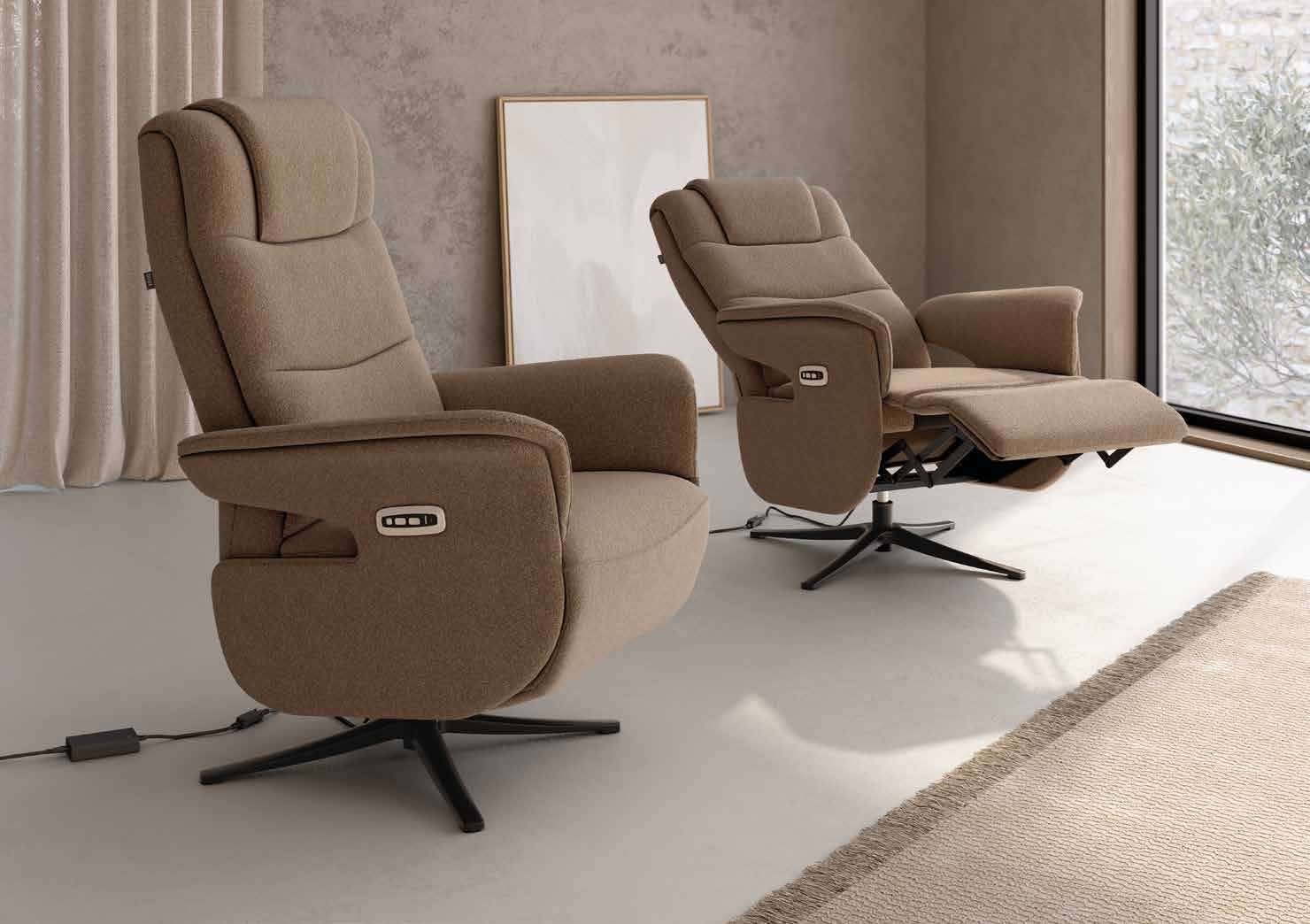 Butaca giratoria 360º tapizada. Relax eléctrica 2 motores. Cabezal ajustable en 3 posiciones. Pata metálica negra. Puerto de carga USB. Combina líneas suaves, cabezal regulable y sistema relax para elevar el confort del salón.