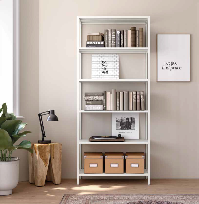 Estantería con estructura de metal. Estantes fijos. Disponible en color crema y negro para adaptarse a distintos ambientes.