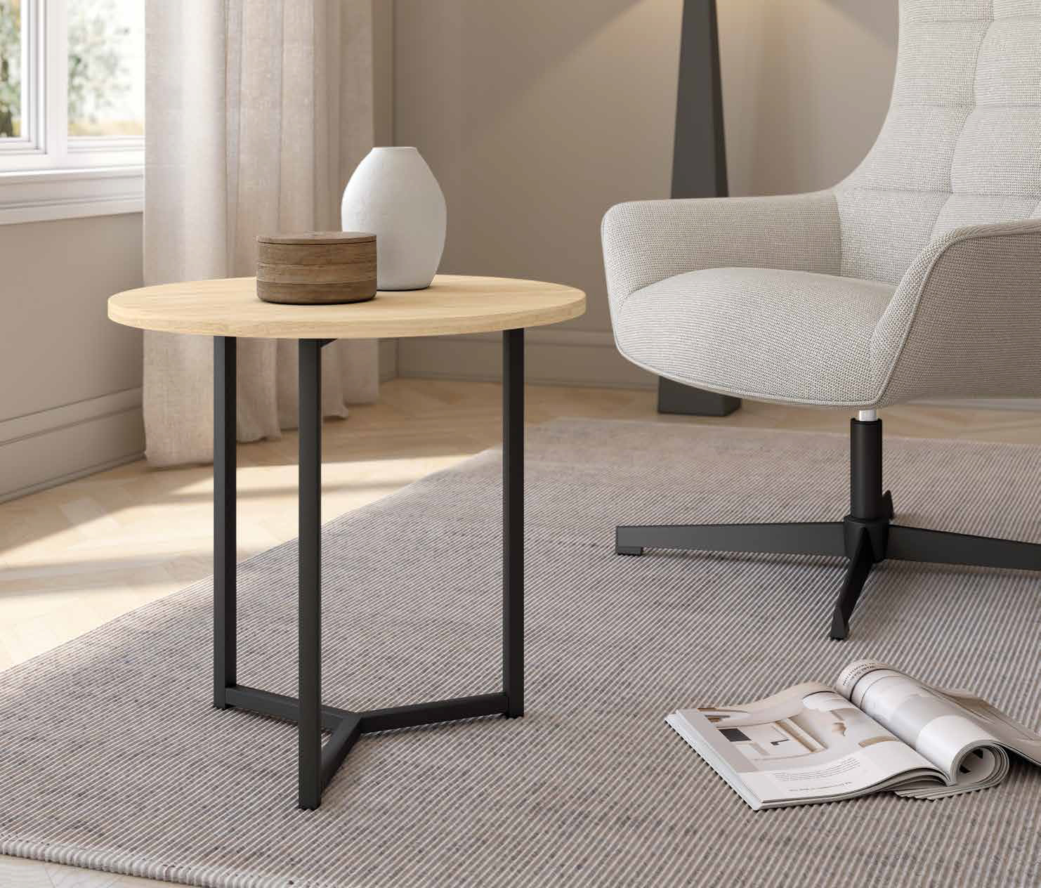 Mesa auxiliar redonda con estructura metálica marfil o negra y sobre de 15 mm en acabado melaminas. Disponible en Ø50. Se presenta en acabados Alpin, Artic, Java y más. Puedes elegir estructura marfil y negro. Ideal para quienes buscan una mesa funcional, resistente y con una estética cuidada.