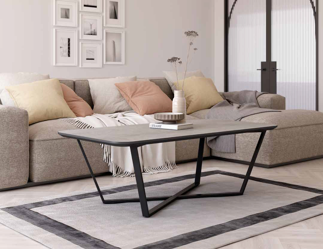 Mesa de centro con pata metálica negra y sobre de MDF biselado de 25 mm en acabado diseño piedras. Disponible en 120 x 60. Se presenta en acabados Porland, Carrara y Marquina. Ideal para quienes buscan una mesa funcional, resistente y con una estética cuidada.
