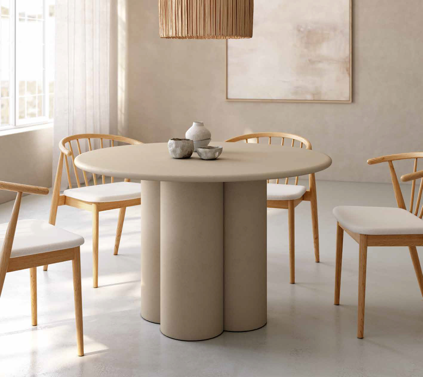 Mesa redonda de comedor fija de MDF con acabado de microcemento. Sobre con cantos redondeados de 25 mm. Sólo apta para interior. Disponible en acabados Beige, Moka. Se presenta en medidas Ø120.