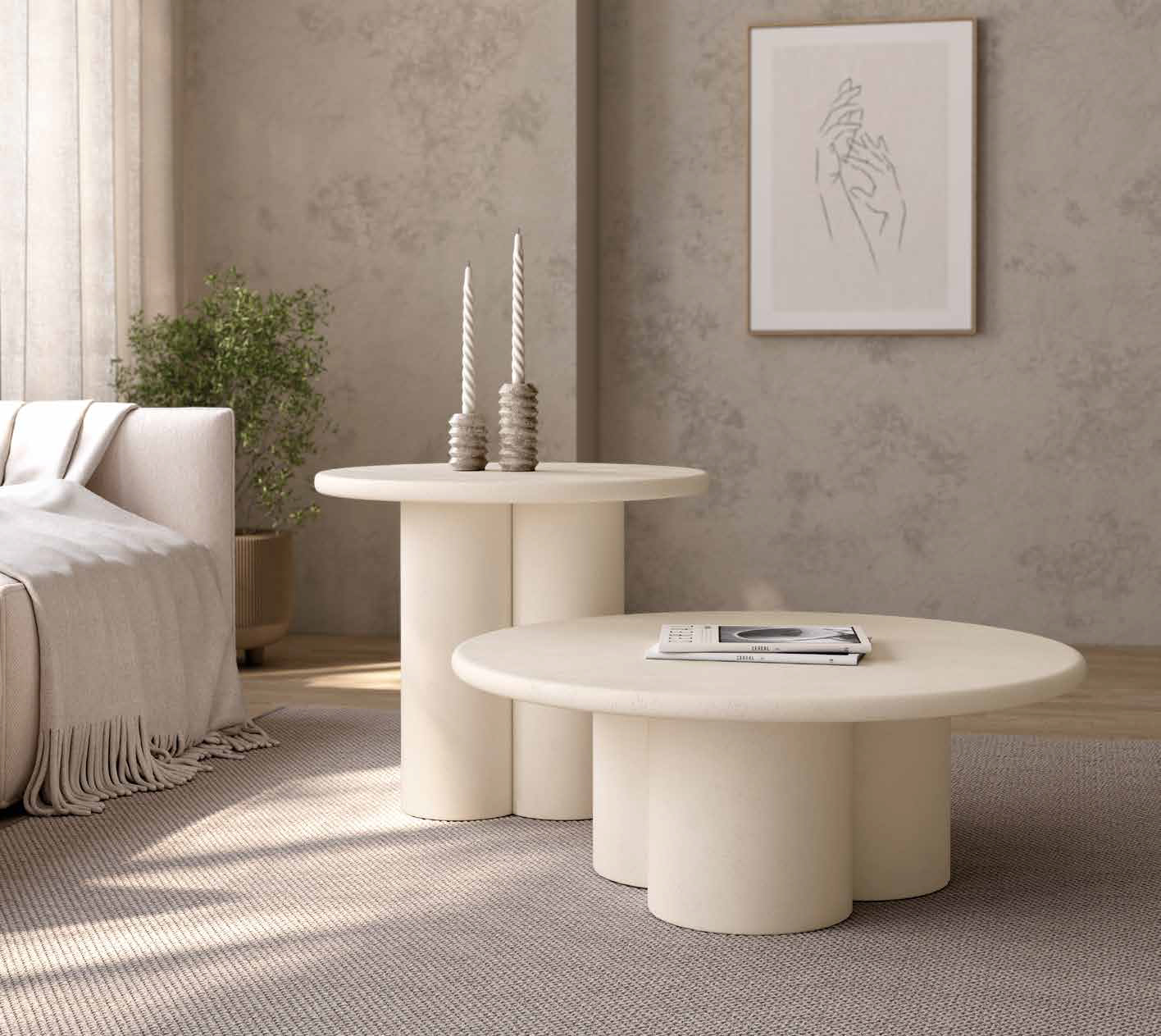 Mesas redondas auxiliares de MDF con acabado de microcemento. Sobre con cantos redondeados de 25 mm. Sólo aptas para interior. Disponible en acabados Beige, Moka. Se presenta en medidas Ø60, Ø80.