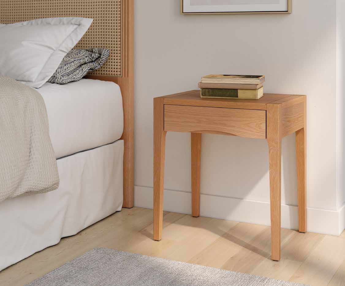 Mesita de fresno natural con un cajón y tirador uñero. Diseño funcional y limpio para acompañar el dormitorio.
